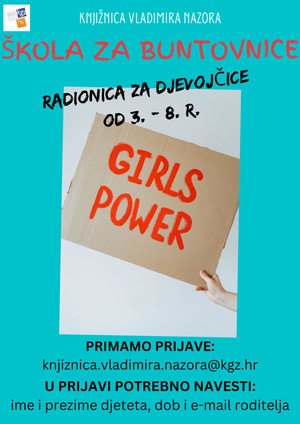 Radionica za djevojčice od 3.- 8. razreda inspirirana i temeljena na knjigama Priče za laku noć za mlade buntovnice i Priče o neustrašivim hrvatskim ženama.U današnjem svijetu u kojemu djevojčice od rane dobi bivaju okružene pomalo iskrivljenim vrijednostima, upoznat ćemo ih s neustrašivim ženama koje su ostavile trag svojim djelovanjem, borbama i neustrašivim duhom.