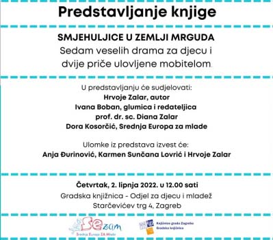 Hrvatski centar za dječju knjigu i nakladnička kuća Srednja Europa pozivaju vas na predstavljanje knjige dramskih igara i priča za djecu Hrvoja Zalara Smjehuljica u Zemlji mrguda, u četvrtak, 2. 6. 2022. godine u 12 sati u multimedijalnoj dvorani Odjela za djecu i mladež s mediotekom Gradske knjižnice!
