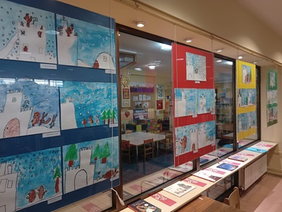 Izložba likovnih radova pod naslovom Snježni dvorac nastala je u školskom radu učenika 2.b i 2.d razreda osnovne škole Luka Sesvete, a nakon čitanja istoimene slikovnice koju je napisala Nina Vađić i ilustrirala Ana Kadoić.Inspirirani tekstualnim i likovnim sadržajem slikovnice djeca su pod mentorstvom svojih učiteljica, Mirne Turniški i Ljiljane Frigan Perko, u kombiniranim tehnikama pastele, akvarela i crnog flomastera naslikala svoj doživljaj priče.