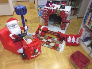 Naša izložba otkriva vam dnevni boravak junaka božićnih priča. Osmišljena crvenim detaljima i toplim kaminom vodi nas u svijet Djeda Božićnjaka.Dođite u knjižnicu i uživajte čitajući priče u veselom društvu i čarobnoj atmosferi.