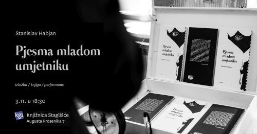 Stanislav Habjan, multimedijski umjetnik, pisac i dizajner predstavlja u Knjižnici Staglišće novu zbirku tekstova za pjevanje Pjesma mladom umjetniku kao osobitu vrst književnog događanja uživo. Posebnost i intrigantnost stvaralaštva Stanislava Habjana u okviru suvremene hrvatske književne scene, posjetitelji ovoga puta mogu doživjeti kroz prožimanje slike, stiha i ritma objedinjenih u autorovoj jedinstvenoj izvedbi.Knjigu prati istoimena izložba, svojevrsna posveta i oda čitanju, koncipirana upravo za prostor knjižnice. Razmjerno nepoznati citati iz razgovora i prepiski Stanislavu dragih pisaca prepliću se s njegovim vlastoručno "slikanim" pjesmama; riznica svjetske književnosti ulazi u neposredni dijalog s najnovijim umjetničkim sadržajem.