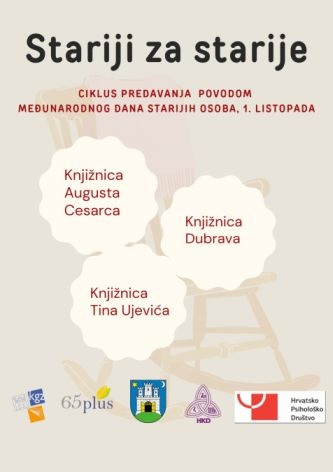 Knjižnice grada Zagreba, projekt 65 plus i Hrvatsko psihološko društvo - Sekcija psihologa u mirovini (PUM-a), pozivaju vas na edukativne programe u okviru ciklusa Stariji za starije kojima obilježavaju 1. listopada, Međunarodni dan starijih osoba. Ovim programom želimo skrenuti pozornost na teme relevantne za starije osobe i njihovu okolinu, a na koje društvo nerijetko zaboravlja. Često su stariji još uvijek „generacija u sjeni“, iako je, prema svim demografskim pokazateljima, 60+ najbrže rastuća dobna kategorija stanovništva. Ciklus je organiziran uz podršku Komisije za prilagodbu i pristupačnost knjižničnih usluga Hrvatskog knjižničarskog društva te Grada Zagreba.Na programe pozivamo sve generacije. One starije, kako bi možda bolje razumjeli sebe, a one mlađe, kako bi bolje razumjeli starije.