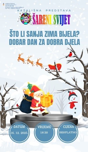 Pozivamo vas na predstavu Kazališta Šareni svijet pod nazivom Što li sanja zima bijela? Dobar dan za dobra djela, koja će se održati u utorak, 16. prosinca 2025. godine, u 18:30 u Multimedijskoj dvorani Knjižnice Dubrava.Predstava je namijenjena djeci od 4 do 10 godina, a ulaz je slobodan.