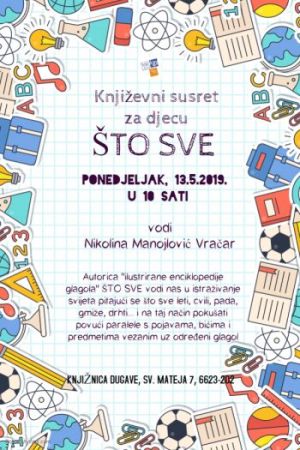 Nikolina Manojlović Vračar, autorica "ilustrirane enciklopedije glagola" Što sve, kroz svoje nas pjesme vodi u istraživanje svijeta pitajući se što sve leti, cvili, pada, gmiže, drhti... Pjesme su životne, šaljive i neobične pa kod djece izazivaju smijeh i interes.Glagole ćemo još bolje upoznati povlačeći paralele s bićima, stvarima i pojavama vezanim uz određeni glagol, a na samom kraju susreta pokušat ćemo ih i nacrtati! Ako mislite da se glagoli ne mogu nacrtati, dođite i uvjerit ćemo vas u suprotno!!