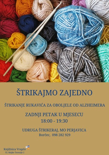 Pozivamo vas na radionice štrikanja, koje će se u našoj knjižnici održavati svakog zadnjeg petka u mjesecu.Udruga Štrikeraj udruga je građana, ljubitelja štrikanja i heklanja, koja djeluje na području MO Perjavica Borčec, GČ Podsused Vrapče.
