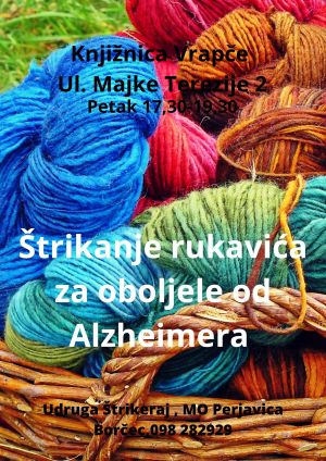 Pridružite nam se na radionici koja će se održati u našoj knjižnici te naučite nešto o štrikanju ili utvrdite postojeće znanje, a sve u dobre svrhe. Naime, na radionici će se izrađivati rukavići za oboljele od Alzheimera.Radionicu održava udruga Štrikeraj. Udruga Štrikeraj je udruga građana, ljubitelja štrikanja i heklanja koja djeluje na području MO Perjavica Borčec, GČ Podsused Vrapče.