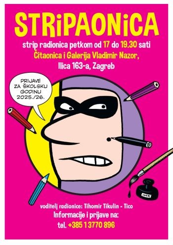 Stripaonica je radno-zabavni program za osnovnoškolce koji se kroz nju upoznaju s prvim koracima u stvaranju stripa. Radi se prvenstveno na jeziku stripa, kako ispričati priču, jasno i ekonomično. Kroz razne zadatke i crtačke vježbe svaki polaznik će savladati crtanje likova i njihov govor tijela (osjećaji vezani uz pokret) uz pomoć kojeg se uspješnije crta priča. Osnovni pribor za početak su papir i obična olovka.Voditelj: Tomislav Tikulin