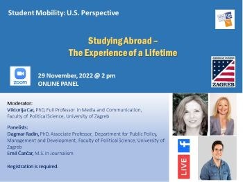 American Corner Zagreb hosts Viktorija Car, Full Professor in Media and Communication, at the Faculty of Political Science, the University of Zagreb, for an online panel: Studying Abroad: The Experience of a Lifetime with the two panelists Dagmar Radin, an Associate Professor of Political Science, at the Faculty of Political Science, the University of Zagreb, and Emil Čančar, M.S. in Journalism.