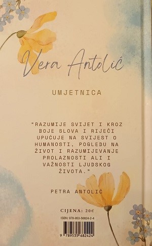 Vera Antolić se bavi primijenjenom i likovnom umjetnošću, što drugim riječima znači, da traži i stvara umjetnost oko sebe. Ispunjena je osoba, ima vrlo bogat unutarnji život. Rođena je u Postojni, živi i stvara u Zagrebu. Bavi se aromaterapijom i eteričnim uljima. Njen dodir su boje, riječ i zvuk, kroz slikarstvo, poeziju i zvukoterapiju. Teme i motivi njezinih djela proizašli su iz osjećanja i pronalaženja izvora u samoj sebi, vanjskim svjetovima, stvara svoju stvarnost, ostavlja je vremenu i prostoru. Dva različita umjetnička svijeta i dva umijeća sljubljuje u jedan svijet.Do sada je imala 49 samostalnih i nekoliko skupnih izložbi, najslobodnija je u tehnici ulje na platnu gdje odlazi u slikanje apstrakcije i oblike koji nikada ne završavaju, nisu joj strane slojevitost boje, te stalno eksperimentiranje. Sudjelovala je na likovnim kolonijama. Izradom plakata i dekoracija osvojila je nagrade na nivou Hrvatske i Europe. Izradom cvjetnih aranžmana sudjelovala je na Floraartu.