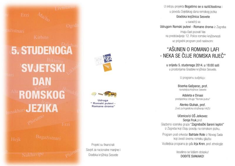 Povodom Svjetskog dana romske književnosti, Udruga Romski putevi - Romane droma iz Zagreba i Knjižnica Sesvete pozivaju Vas na svečano predstavljanje 12. Police romske književnosti, 05. studenoga 2014. u 18h u prostorijama Knjižnice Sesvete, Trg Dragutina Domjanića 6.