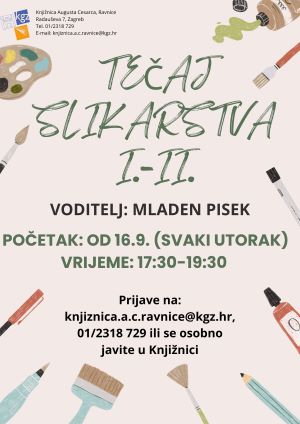 Pozivamo odrasle korisnike na Tečaj slikarstva I-II na kojem će imati priliku naučiti o osnovama slikarstva, kompoziciji, horizontu i perspektivi. Naučeno teorijsko znanje moći će odmah primjeniti u praksi uz voditelja Mladena M. Piseka.Tečaj traje od 16. 9. - 23.12.2025. svaki utorak od 17:30-19:30 sati.