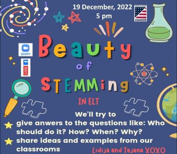The webinar titled The Beauty of Stemming is intended for primary and secondary school teachers who are interested in implementing STEM into their English language classrooms. STEM-based lessons teach learners more than scientific concepts. They bring innovation into their lives enabling them to develop and implement their thinking skills. The international eTwinning project »STEM Influencers« is an example of how the English language can be taught and learned in the context of other fields represented in the school curriculum.The presenters Lidija Šaravanja i Tajana Bundara will share their experiences and show some efficient ways of empowering students with 21st century skills (4Cs and 4Rs) and encouraging them to do their own content and language research for/through the process of creation. With this approach students are motivated to use both English language and ICT skills as tools to reach their aims. They are encouraged to use similar videos and tutorials as references from reliable sources.