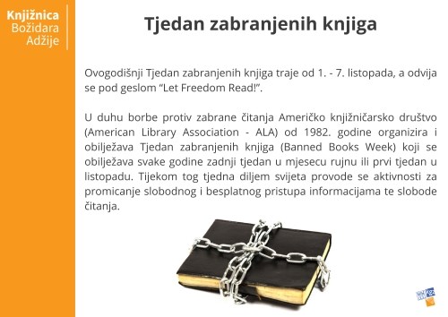 Knjižnica Božidara Adžije ove godine priključuje se obilježavanju Tjedna zabranjenih knjiga, od 1. do 7. listopada 2023. godine, knjižnim izlogom pod motom “Let Freedom Read!” u prostoru Studijske čitaonice. Knjigama koje su zabranjivane tijekom povijesti zamjerao se nemoral, eksplicitne scene seksa, čarobnjaštvo, siromaštvo ili, pak, protivljenje službenim stavovima raznih religijskih učenja i sl. Među inim „zabranjenim“ knjigama bile su Gospođa Bovary, Ljubavnik lady Chatterley, Dnevnik Anne Frank, Lolita, Stakleno zvono, Životinjska farma, Gospođa Dalloway, Balade Petrice Kerempuha i Ubiti pticu rugalicu. S naše police možete posuditi neke od tih zabranjivanih knjiga.U prvom tjednu mjeseca listopada 2023. godine Američko knjižničarsko društvo (American Library Association - ALA) organizira i obilježava već tradicionalni Tjedan zabranjenih knjiga (Banned Books Week) od 1982. godine, s ciljem borbe protiv zabrane čitanja, koji se ponekad održava i zadnji tjedan mjeseca rujna ili prvi tjedan u listopadu. Tada se diljem svijeta provode aktivnosti koje promiču slobodan i besplatan pristup informacijama i slobodu čitanja s namjerom okupljanja cijele knjižne zajednice, odnosno svih sudionika koji na bilo koji način posreduju ili utječu na čitanje od knjižničara, edukatora, učitelja i nastavnika, autora, izdavača, knjižara do čitatelja u najširem smislu. Namjera Tjedna zabranjenih knjiga jest skrenuti pozornost javnosti na štetu cenzure, odnosno na štetu uklanjanja ili ograničavanja pristupa pojedinim knjigama. Ured za intelektualnu slobodu (Office for Intellectual Freedom - OIF) sastavlja popise osporavanih knjiga za proteklu godinu prema izvješćima u medijima te prema izvješćima knjižničara i učitelja diljem Sjedinjenih Američkih Država. Popis za 2022. godinu nalazi se na poveznici s, čak, 13 osporavanih naslova.