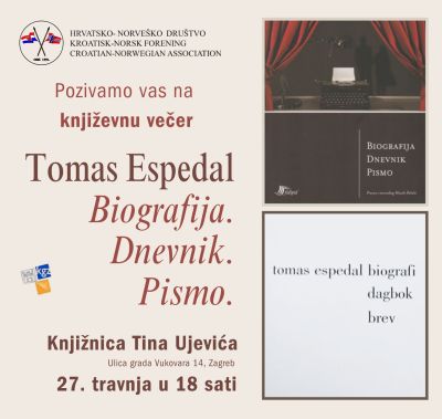 Književna večer u suradnji s Hrvatsko-norveškim društvom donosi predstavljanje iznimnog djela suvremenog norveškog autora Tomasa Espedala. Riječ je o knjizi Biografija. Dnevnik. Pismo., eksperimentalnom književnom ostvarenju koje na jedinstven način spaja elemente memoara, pisama i dnevničkih zapisa, brišući granice između žanrova i stvarnosti.