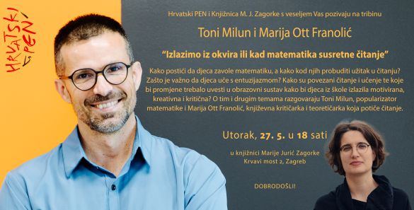 Hrvatski PEN i knjižnica M.J. Zagorke s veseljem Vas pozivaju na tribinu Toni Milun i Marija Ott Franolić: “Izlazimo iz okvira ili kad matematika susretne čitanje” koja se odvija u sklopu ciklusa Svijet se sastoji od riječi: čitanje, učenje i kreativnost, u organizaciji Hrvatskog P. E. N. Centra.
