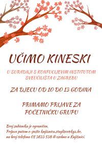 Radionice kineskog jezika namijenjene su djeci od 10 do 13 godina. Program je organiziran u ciklusima, svaki u trajanju od 9 tjedana, a profesori su izvorni govornici kineskog jezika. Potrebno je osnovno poznavanje engleskog jezika. Dinamika nastave je jednom tjedno po 60 minuta, u grupama od 4 do 8 polaznika.