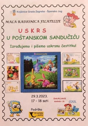 Draga djeco,pozivamo vas na uskršnju radionicu "Uskrs u poštanskom sandučiću" u srijedu, 29. ožujka, u 17 sati koju ćemo ove godine održati u suradnji s Malom radionicom filatelije.