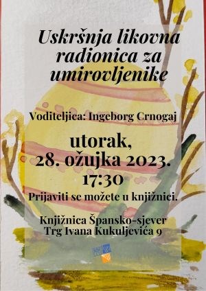 Likovna radionica pod stručnim vodstvom slikarice Ingeborg Crnogaj na kojoj će korisinici knjižnice (65+) u tehnici akvarela oslikavati uskršnja jaja.