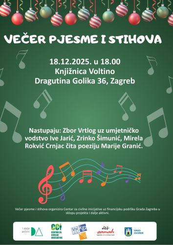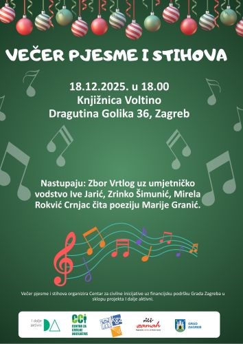Večer pjesme i stihova organizira Centar za civilne inicijative uz financijsku podršku Grada Zagreba u sklopu projekta I dalje aktivni.Aktivnost se provodi u sklopu projekta 65 plus.