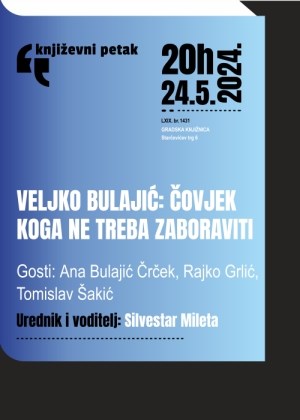 O stvaralaštvu Veljka Bulajića na filmskoj tribini Književnoga petka 24. svibnja razgovaraju redatelj Rajko Grlić, slikarica maske Ana Bulajić Črček i filmolog Tomislav Šakić.