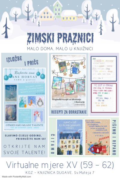 Zimski praznici u knjižnici Dugave donose nastavak (polu)virtualnih mjera koje smo započeli u prosincu, zajedno skupljene pod brojem XV. Izaberite nešto od ponuđenih radionica, donesite nam svoje radove, zavirite i u prijašnje virtualne mjere, čitajte, pišite recenzije, zabavite se i budite kreativni!