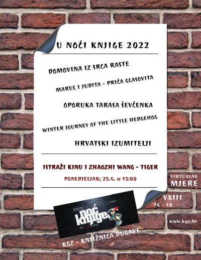 Pregledajte što smo vam pripremili i virtualno i uživo u prostoru knjižnice povodom Noći knjige. Pridružite nam se u ponedjeljak, 25.4. u 13:00, razgledajte izložbu i poslušajte priču koju će na kineskom i hrvatskom pročitati Zhaozhi Wang - Tiger, istražite zajedno s nam KINU - kroz zanimljive i zabavne činjenice, i tako proslavite knjigu i slobodu čitanja!