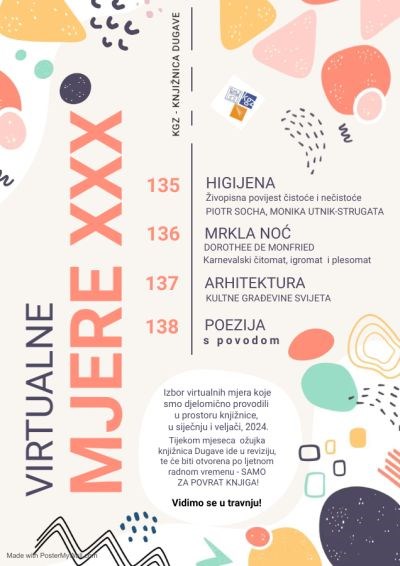 Popis virtualnih mjera koje su se djelomično održavale i uživo, u prostoru knjižnice tijekom siječnja i veljače, 2024. Knjižnica je u ožujku u reviziji te je otvorena samo za povrat knjiga, i radi po ljetnom radnom vremenu. Vidimo se u travnju!