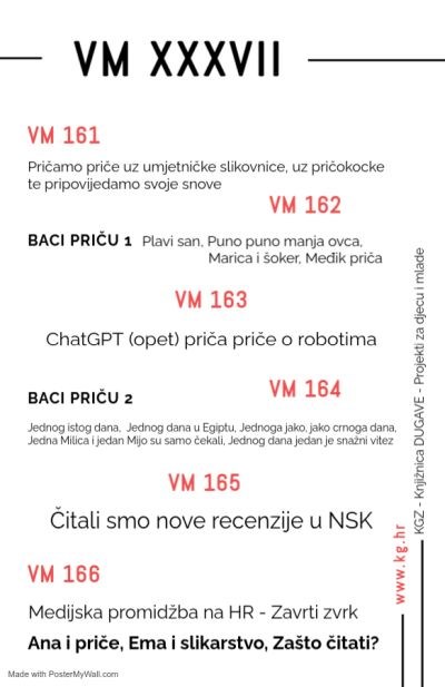 Neka vam virtualne mjere koje smo postavili u Mjesecu hrvatske knjige 2024., posluže kao inspriracija za zajedničko obiteljsko virtualno druženje. Pridružite nam se u kreiranju novih virtualnih događanja kao i onih koje organiziramo u sklopu projekata za djecu i mlade u knjižnici: Otkrivamo mlade talente, Cronauti, KLJUČ do znanja i Virtualne mjere.