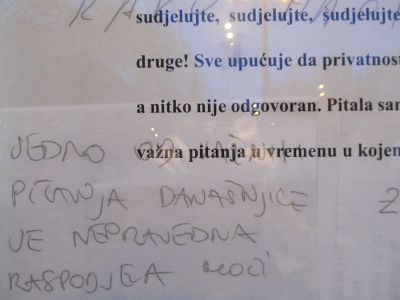 No, Ivana Keser ne zadržava se samo teorijski na obrani dokoličarenja. Postavljajući uvećane stranice svojih bilježaka u prozore galerije, ona poziva prolaznike na čitanje, a to znači na zadržavanje - na kratkotrajno zaboravljanje obaveza, pristajanje na „gubljenje“ vremena, rupu u dnevnom rasporedu. Na dokolicu.