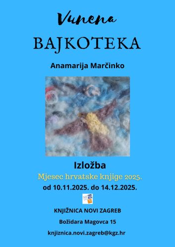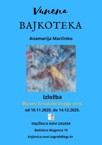 Vunena bajkoteka naziv je koji objedinjuje izložbu i pričaonicu posvećenu likovima iz djela poznatih hrvatskih pisaca, u filcanoj izvedbi naše kreativne knjižničarke Anamarije Marčinko.Uz prvi dio izložbe koji je predstavljen od 10. 11. 2025. u prostoru Knjižnice, na poveznici će biti dostupna i digitalna izložba uz izabrane stihove i ulomke najljepših hrvatskih bajki, priča i pjesama za djecu koje su autorici izložbe poslužili kao inspiracija za njezina djela.