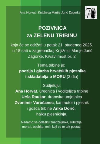 Održat će se još jedan susret iz ciklusa "Zelenih tribina" na temu poezija i glazba hrvatskih pjesnika i skladatelja o moru. Na tribini će sudjelovati Ana Horvat, urednica i voditeljica tribine, Urša Raukar, dramska umjetnica, Zvonimir Varošanec, kantautor i gost tribine te Anka Dorić, haiku pjesnikinja.