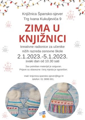 Zima u knjižnici je program za djecu nižih razreda osnovne škole pod vodstvom stručne osobe.Radionice su usmjerene na poticanje kreativnosti i kreativnog izražavanja, a djeca će imati priliku okušati se u različitim tehnikama crtanje, slikanje, kolažna tehnika, modeliranje plastelinom. Sav potreban materijal je osiguran.