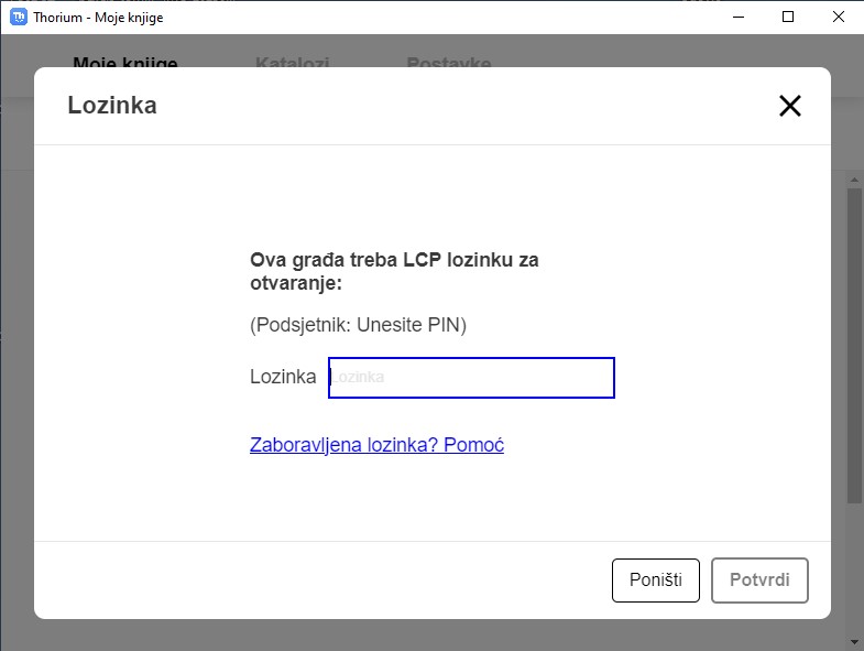 Prilikom otvaranja prvog posuđenog naslova aplikacija će tražiti autorizaciju. Potrebno je unijeti broj iskaznice i korisnički PIN koji vam je dodijelila knjižnica.