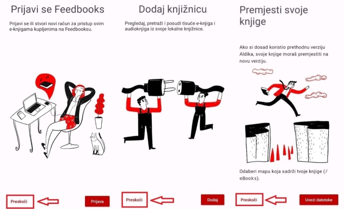 Ako prvi put koristite aplikaciju Cantook by Aldiko i niste korisnik drugih digitalnih knjižnica, u sljedeća tri koraka odaberite gumb Preskoči.