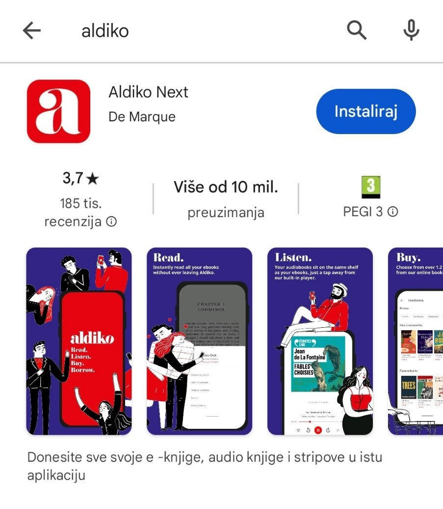 Aplikacija Cantook by Aldiko dostupna je u mrežnim trgovinama Google Play i App Store. Pritiskom na gumb Instaliraj započinje preuzimanje aplikacije na mobilni uređaj.