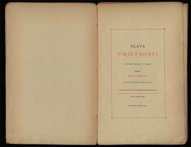 Svečana prva predstava u novoj zgradi održana je nakon otvorenja 14. listopada 1895. godine. Najprije je izveden alegorijski "scenski prolog" u tri slike Slava umjetnosti Stjepana Miletića uz glazbu Ivana Zajca, a na kraju večeri otpjevana je posljednja slika Zajčeve opere Nikola Šubić Zrinjski, uz glasoviti zbor U boj, u boj!