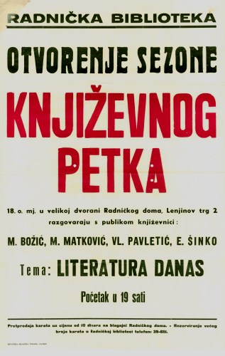 Zbirka Arhiv Književnog petka, zvučni zapisi (1957–1976): magnetofonske vrpce, jedinica 162 i audiokasete, jedinica 58.Knjižnica Božidara Adžije u okviru projekta Digitalizirana zagrebačka baština započinje u ožujku 2017. digitalizaciju zvučnih zapisa iz svoje zbirke Arhiv Književnog petka. Digitalizacija obuhvaća magnetofonske trake i audiokasete snimljene na tribinama Književnog petka u Radničkoj biblioteci Božidara Adžije na Krešimirovom trgu, u razdoblju od 1959. do 1969. godine. Projekt Glasovi Književnog petka 2017.-te sufinanciran je sredstvima Ministarstva kulture Republike Hrvatske i Grada Zagreba.