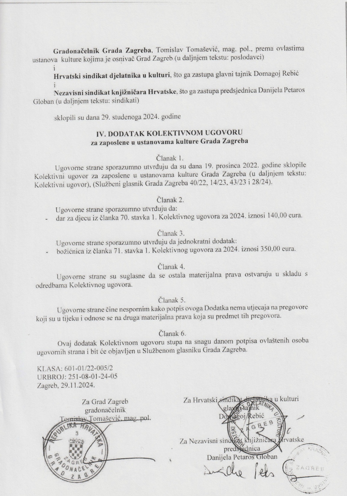 - IV. dodatak Kolektivnom ugovoru za zaposlenike u ustanovama kulture Grada Zagreba